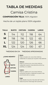 La Camisa Cristina , confeccionada en 100% algodón, ofrece una textura suave y transpirable para una comodidad excepcional. Su diseño incluye cuello elegante y botones funcionales que realzan su sofisticación, ideal para un estilo refinado y versátil en cualquier ocasión.